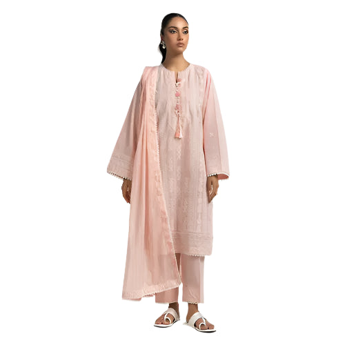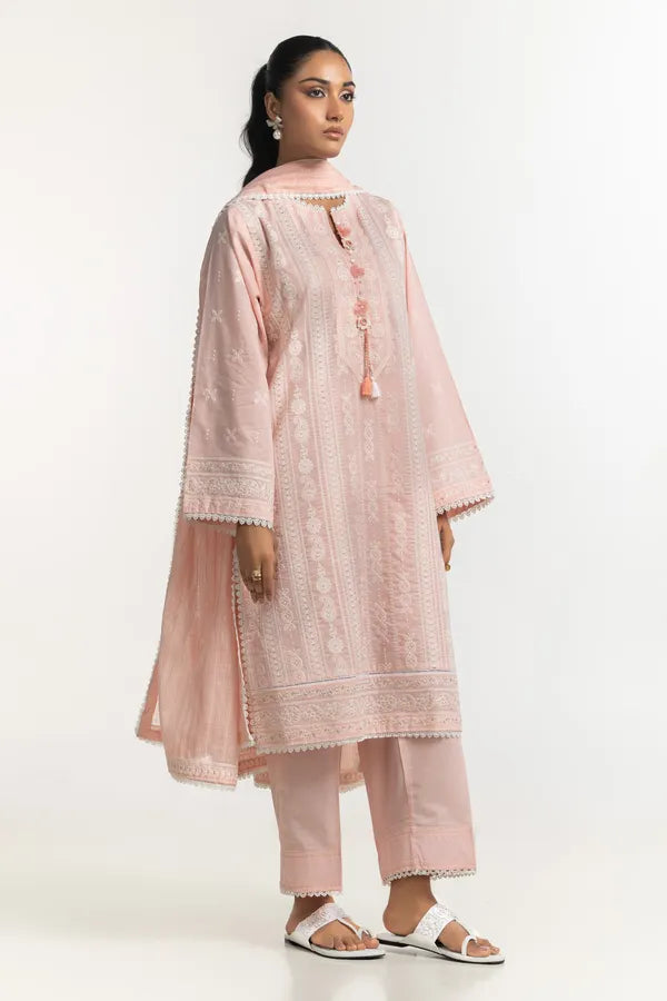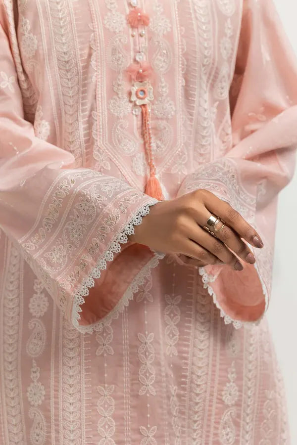 Details: Chikankaari embroidered cambric suit with a Round – Neckline, tassels, and embroidered sleeves